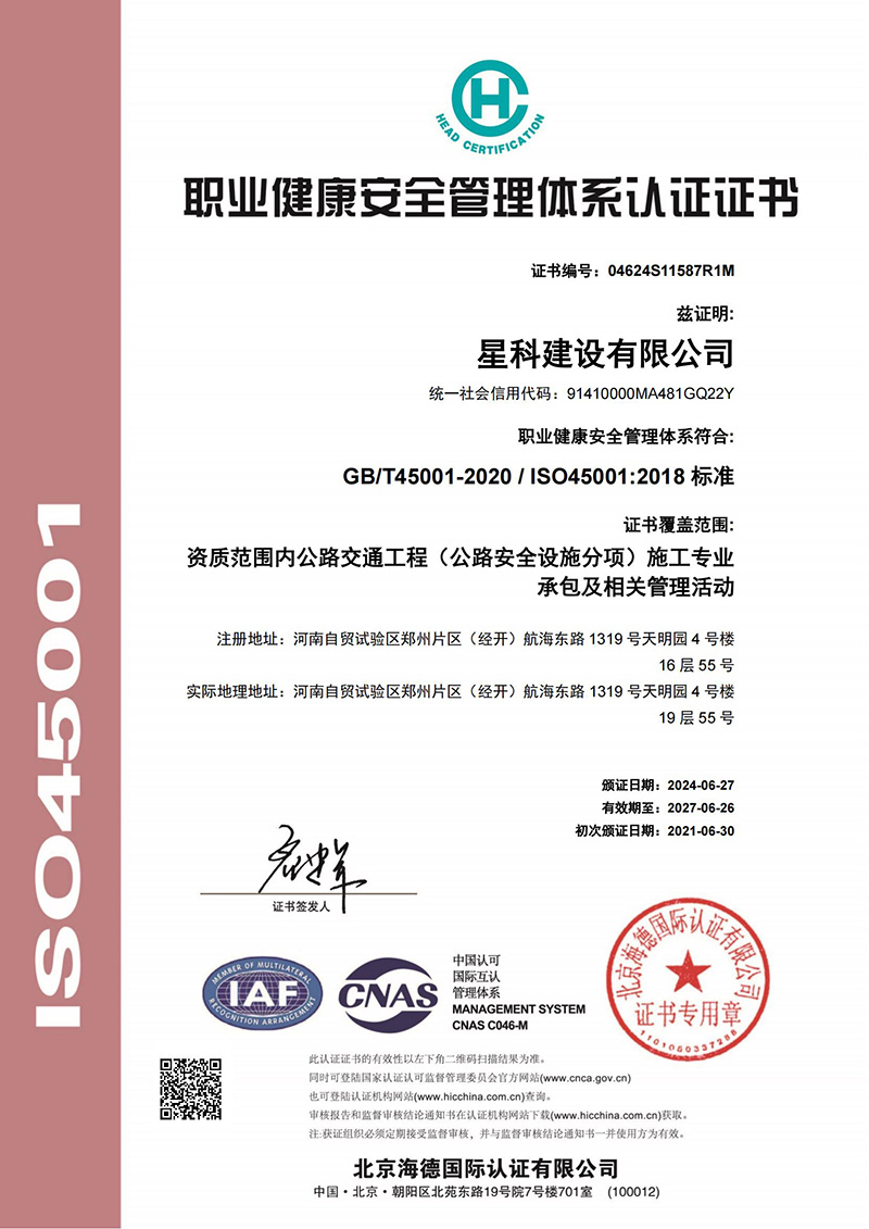 职业健康安全管理体系认证证书