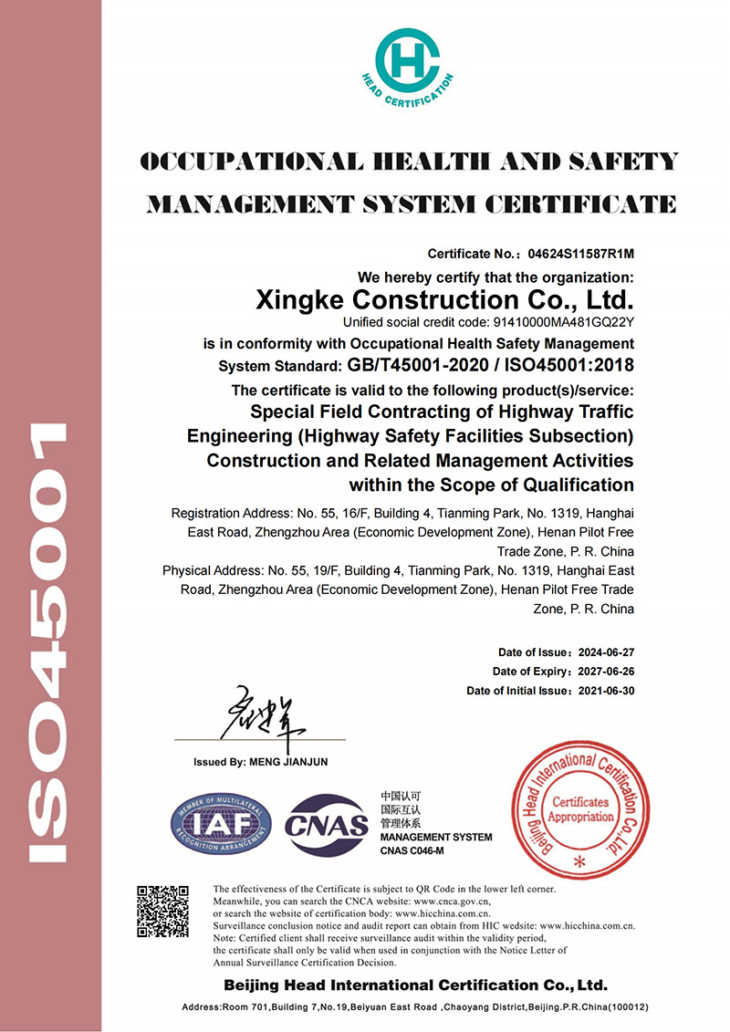 职业健康安全管理体系认证证书